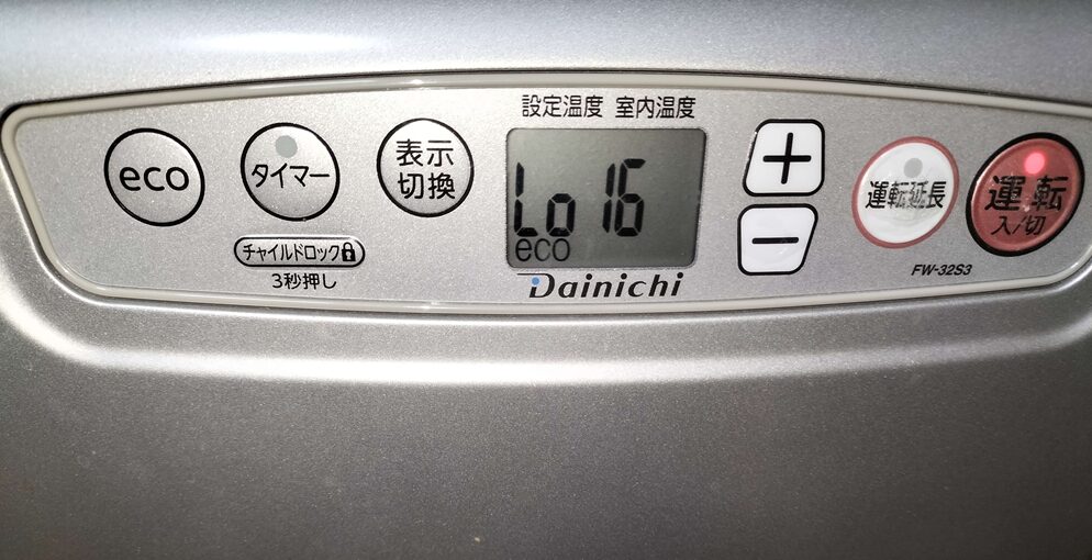 さらに、ストーブの設定温度も最低の12度以下の「数値がマイナスカンストするLo」にしています。
